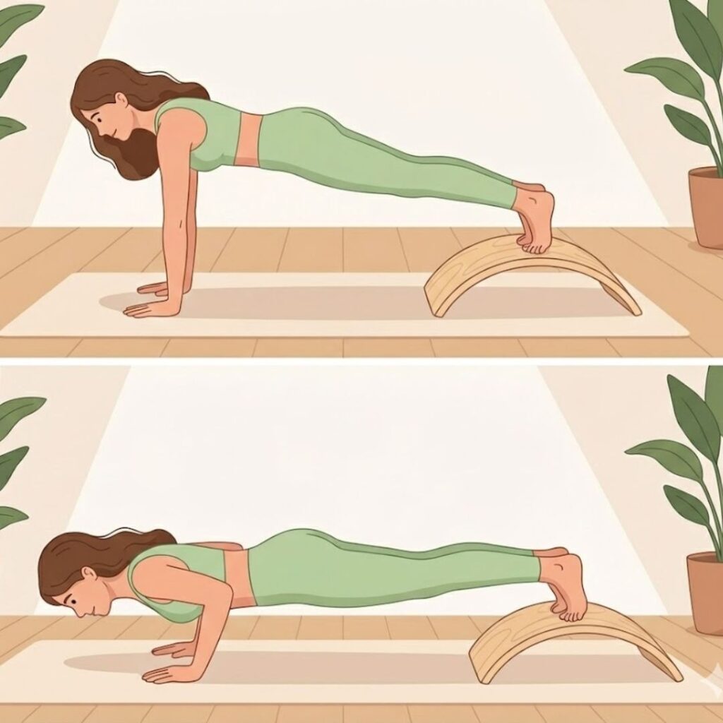 大胸筋(胸)と上腕三頭筋(二の腕)を中心に効かせることができる木製バランスボードを使った「上半身の引き締めエクササイズ」。